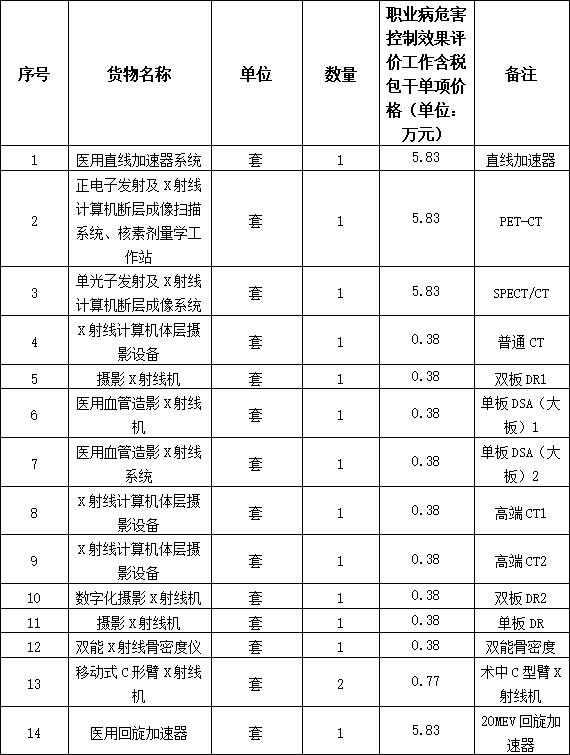 1.1.2服務內(nèi)容: 綿陽三江醫(yī)院項目(一期)職業(yè)病危害控制效果評價工作全部工作內(nèi)容:進行現(xiàn)場驗收檢測并編制職業(yè)病危害放射防護控制效果評價工作報告書,協(xié)調(diào)市衛(wèi)健部門召開職業(yè)病危害控制效果評價工作報告專家審核會議,通過專家評審,并最終取得批復。具體設備如下:
