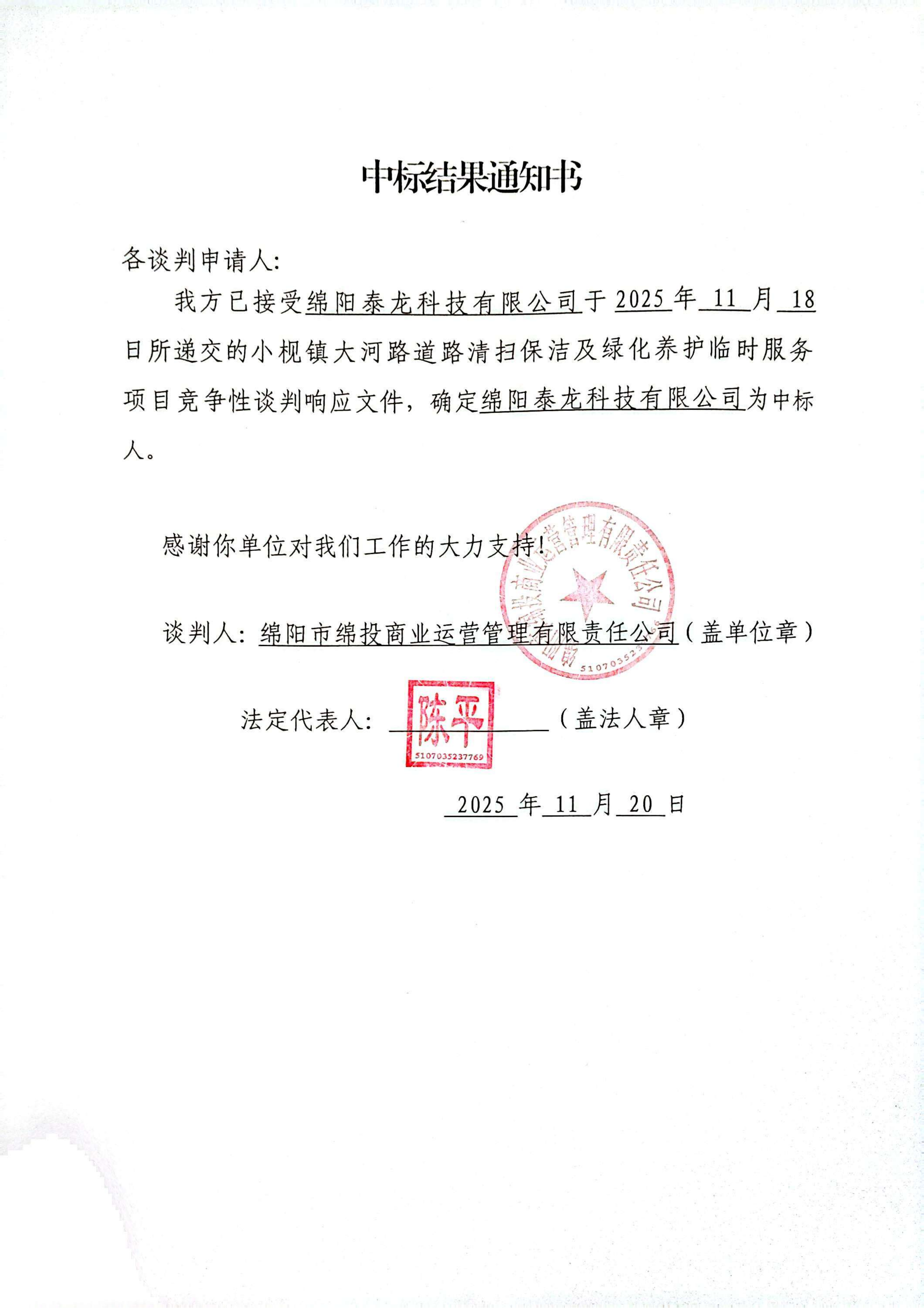 我方已接受綿陽泰龍科技有限公司于2025年 11 月 18 日所遞交的小枧鎮(zhèn)大河路道路清掃保潔及綠化養(yǎng)護(hù)臨時(shí)服務(wù)項(xiàng)目競(jìng)爭(zhēng)性談判響應(yīng)文件,確定綿陽泰龍科技有限公司為中標(biāo)人。