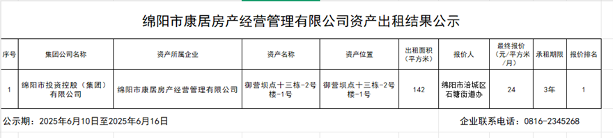 綿陽市康居房產(chǎn)經(jīng)營管理有限公司資產(chǎn)出租結(jié)果公示
