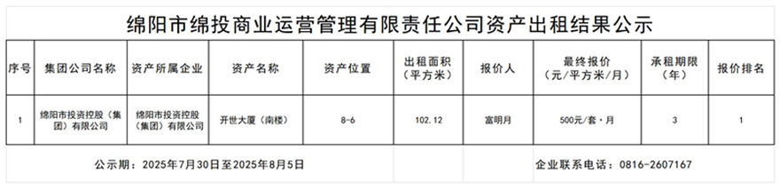 綿陽(yáng)市綿投商業(yè)運(yùn)營(yíng)管理有限責(zé)任公司資產(chǎn)出租結(jié)果公示
