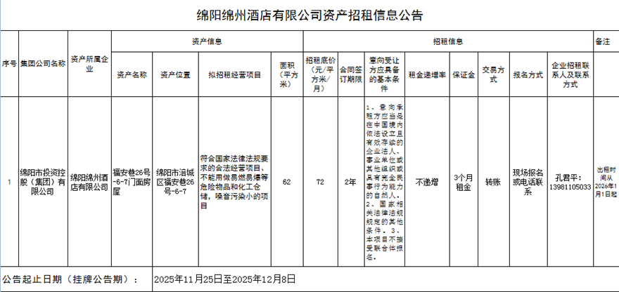 綿陽綿州酒店有限公司資產(chǎn)招租信息公告