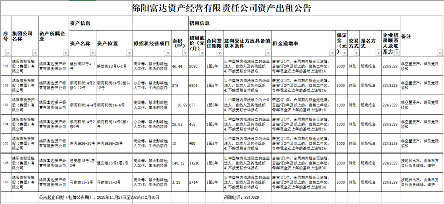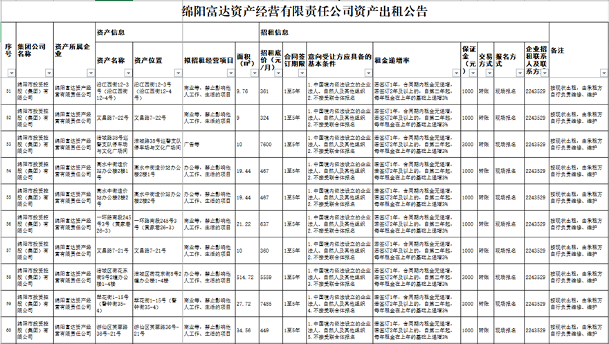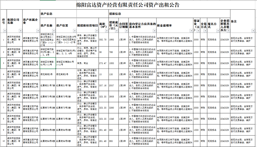 綿陽富達(dá)資產(chǎn)經(jīng)營有限責(zé)任公司資產(chǎn)出租公告