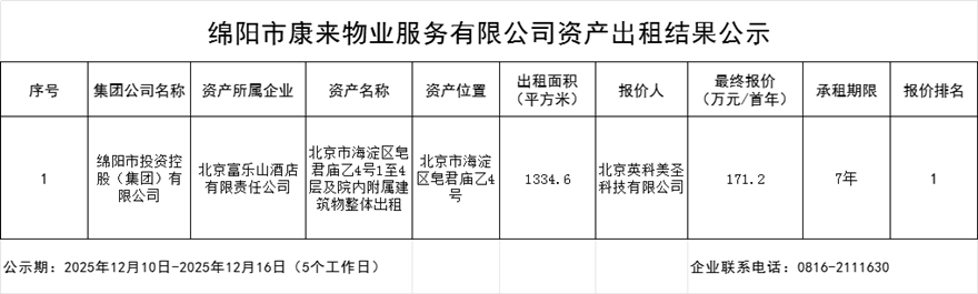 綿陽市康來物業(yè)服務有限公司資產(chǎn)出租結(jié)果公示
