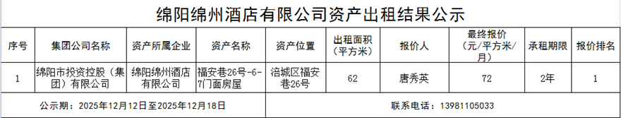 綿陽(yáng)綿州酒店有限公司資產(chǎn)出租結(jié)果公示