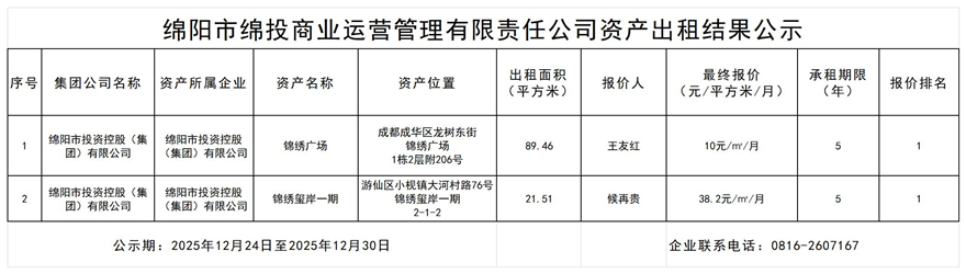 綿陽市綿投商業(yè)運營管理有限責任公司資產出租結果公示