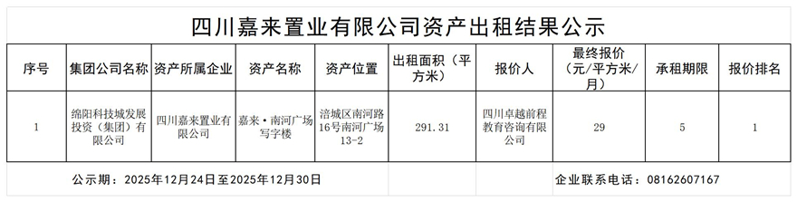 四川嘉來(lái)置業(yè)有限公司資產(chǎn)出租結(jié)果公示