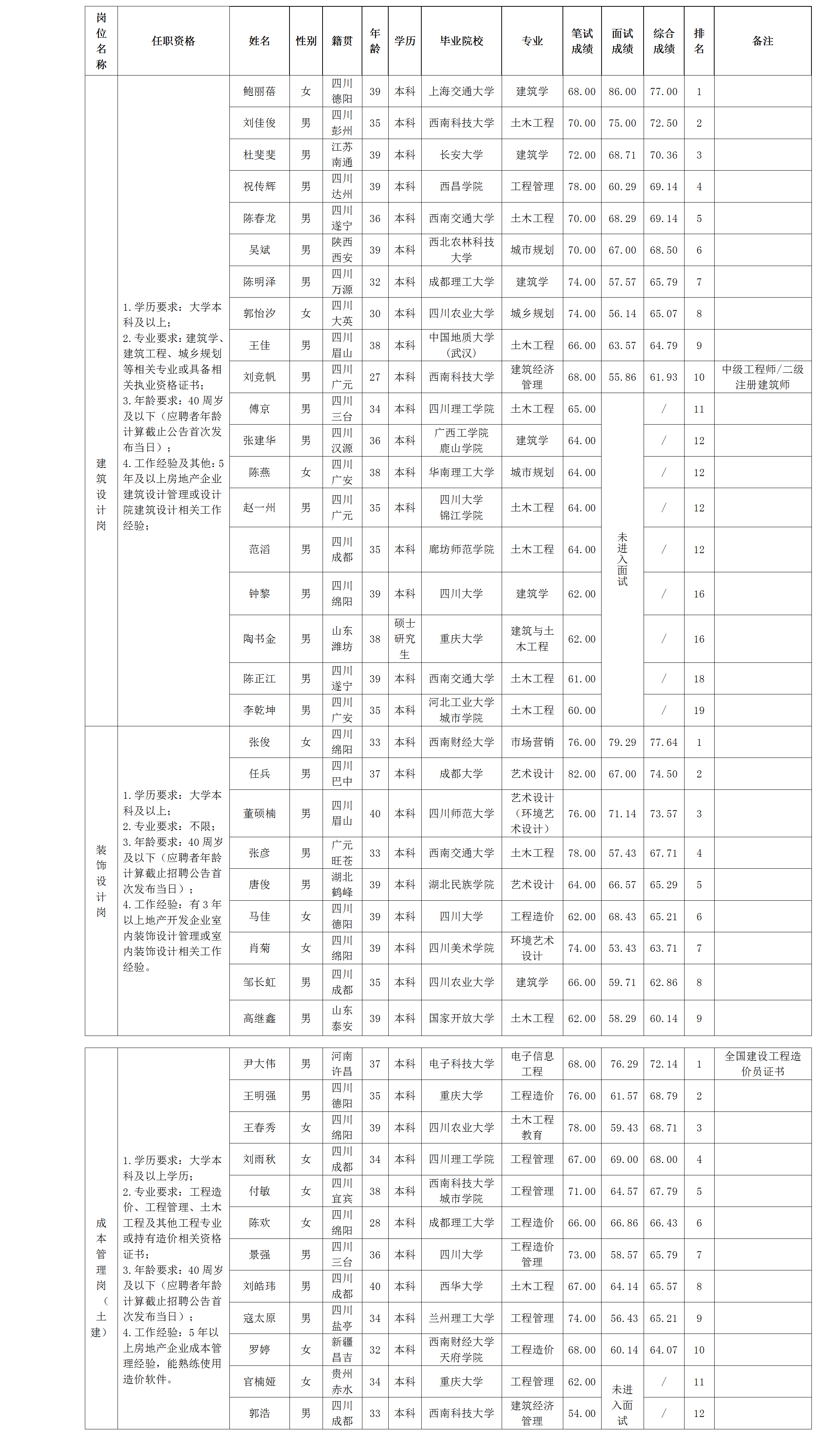 【公開招聘】綿陽市綿投置地有限公司關(guān)于建筑設(shè)計(jì)崗等崗位測(cè)試成績(jī)的公示