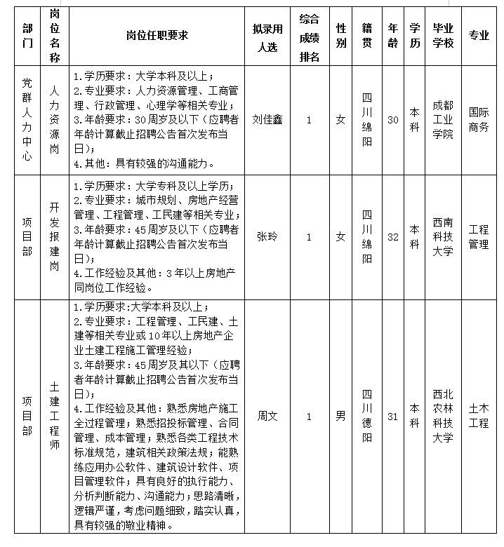 根據綿陽市綿投置地有限公司發(fā)布的招聘公告及招聘相關規(guī)定,經筆試、面試、考察、體檢等程序,擬錄用劉佳鑫等3名同志到綿陽市綿投置地有限公司工作,現予以公示,具體情況如下: