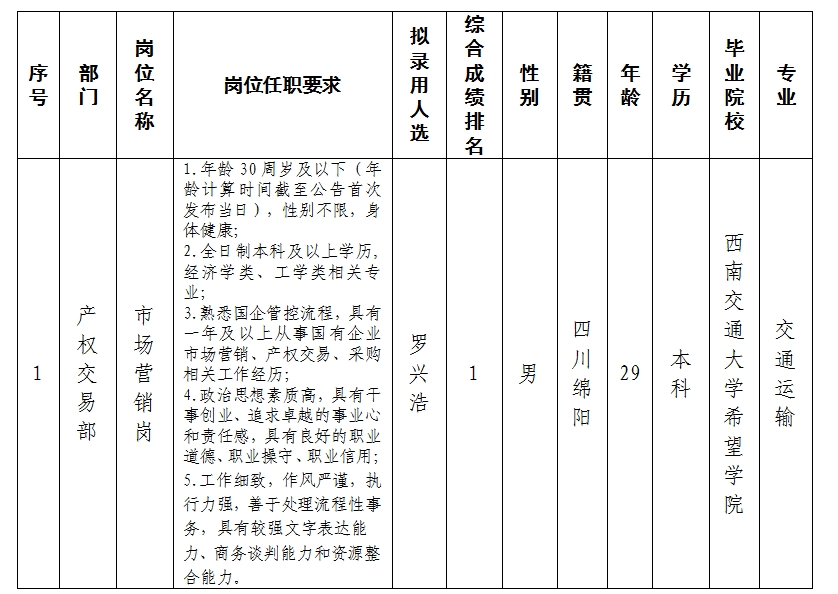 根據(jù)綿陽市綿投商業(yè)運營管理有限責任公司發(fā)布的招聘公告及招聘相關(guān)規(guī)定,經(jīng)筆試、面試、考察、體檢等程序,擬錄用羅興浩同志到產(chǎn)權(quán)交易部工作,現(xiàn)予以公示,具體情況如下: