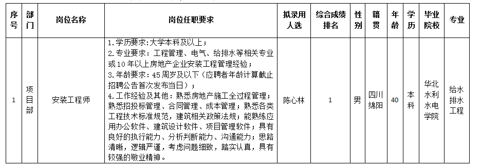【公開招聘】綿陽(yáng)市綿投置地有限公司關(guān)于招聘安裝工程師崗位擬錄用人員的公示