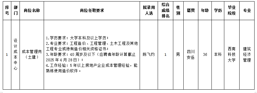 根據(jù)綿陽市綿投置地有限公司發(fā)布的招聘公告及招聘相關規(guī)定,經筆試、面試、考察、體檢等程序,擬錄用陳飛灼同志到綿陽市綿投置地有限公司工作,現(xiàn)予以公示,具體情況如下: