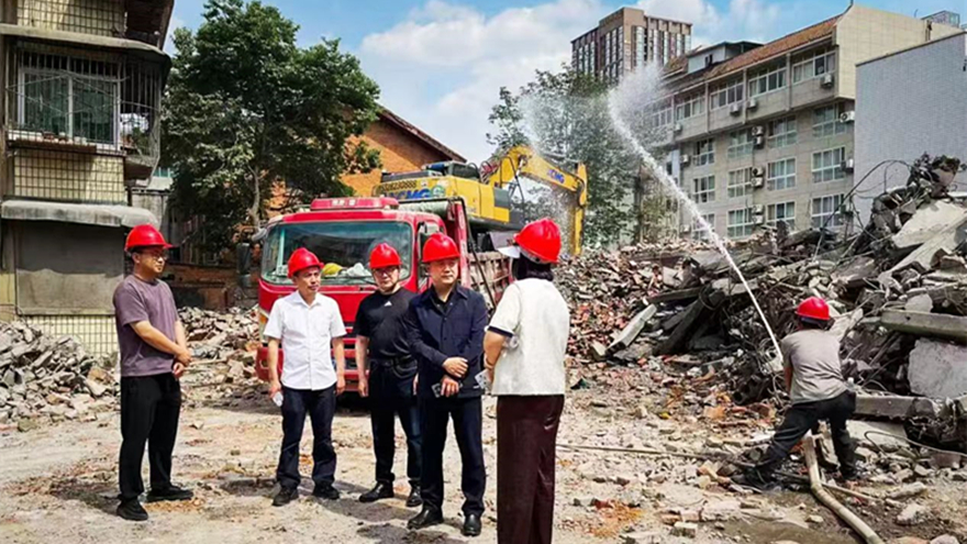 危房緊鄰周邊住宅,施工空間狹小,拆除難度極大。為確保拆除工作安全有序進行,富達公司多次組織建筑、安全專家現(xiàn)場勘查,研究制定了“機械拆除為主,人工配合為輔”的精細化拆除方案。拆除現(xiàn)場,工作人員設(shè)置警戒線封鎖拆除區(qū)域,專人疏導圍觀群眾,維護現(xiàn)場秩序。伴隨著挖掘機的轟鳴聲,危房樓體結(jié)構(gòu)在專業(yè)人員的精準操控下逐步瓦解,同步實施灑水降塵措施,整個拆除過程安全、有序、環(huán)保。